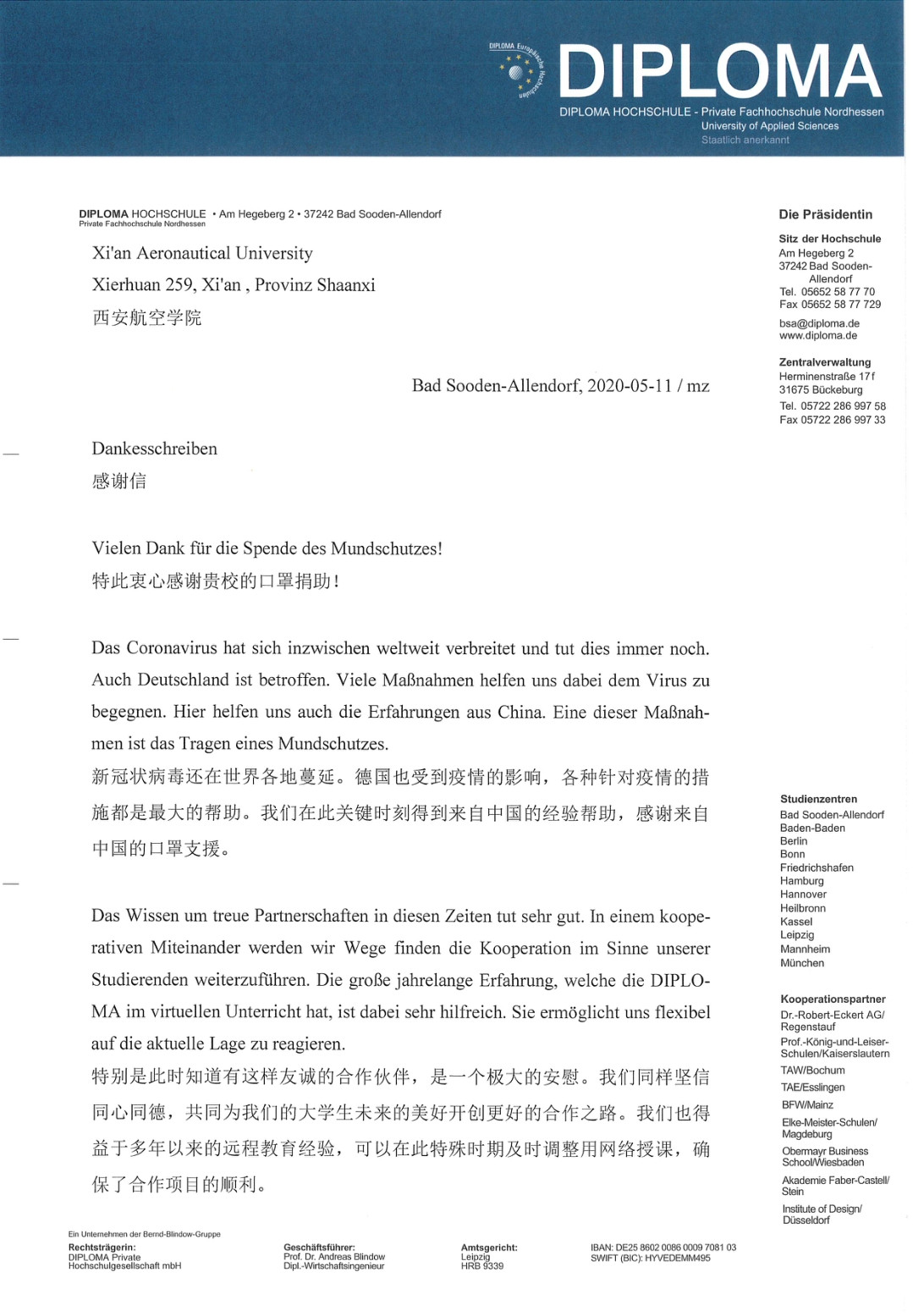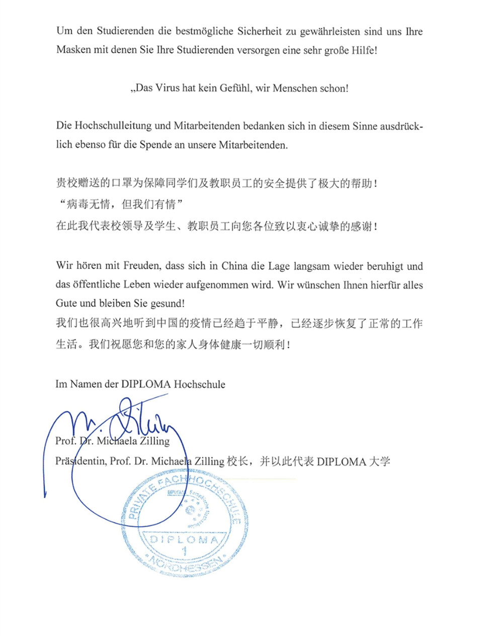 德国北黑森应用技术大学校长MichaeleZilling在给艾弗森贝博ballbet官网的回函中写道:感谢中国的经验帮助和口罩支援。感谢贵校在此刻关键时刻给予的温暖与物资。特别是此时知道有这样友诚的合作伙伴,是一个极大的安慰。我们同样坚信同心同德,共同为我们的大学让未来的美好开创更好的合作之路。