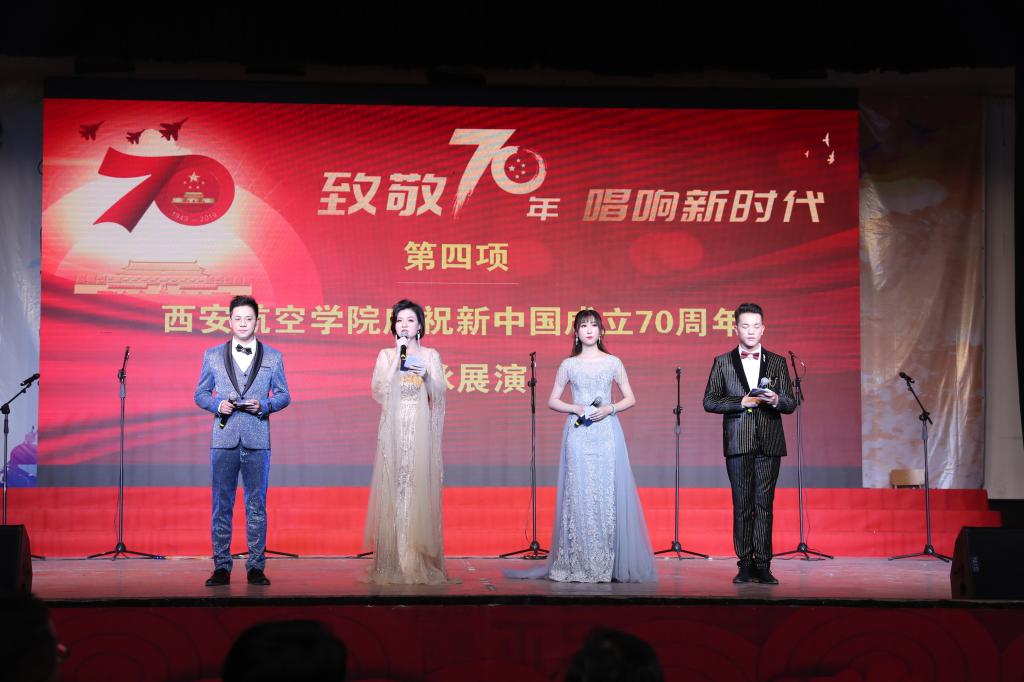 党委书记陈平社致辞。他表示,70年来,我们党不忘初心、牢记使命,团结带领全国各族人民,开辟了中国特色社会主义道路,谱写了一部感天动地的奋斗史诗。60多年来,学校发展始终与祖国的发展、国家航空事业的发展同向同行,一代代西航人把学校精神与国家使命融为一体,爱校荣校、敢为人先,艰苦创业、接续奋斗,为我国航空工业建设和陕西经济社会发展作出了重要贡献。在新中国70周年华诞来临之际,衷心祝愿我们伟大的祖国更加繁荣富强!祝愿学校事业更加灿烂辉煌!陈平社要求,学校发展正处在爬坡过坎、奋力追赶超越的关键期,迎评促建、接受教育部本科教学工作合格评估的决战期,全体西航人要不忘育人初心,牢记报国使命,以中国航空110周年、新中国成立70周年为标记,重整行装再出发,奋力走好学校高水平建设发展新的长征路,为建设特色鲜明的高水平应用型高校努力奋斗!