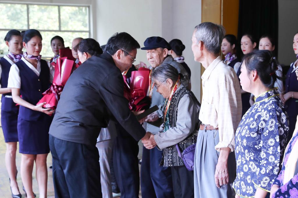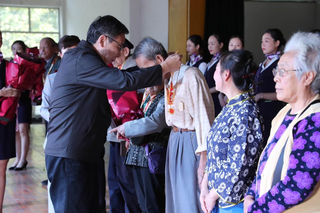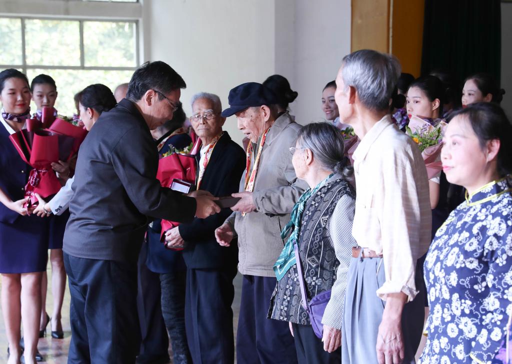 陈平社为获得殊荣的11位离休老同志逐一颁发纪念章。他在致辞中指出,70年来,在中国共产党的坚强领导下,我们的国家进行了社会主义革命、建设、改革等一系列艰辛探索,实现了站起来、富起来到强起来的伟大飞跃。我们的学校是随新中国航空工业同期布局的一所培养应用型人才的学校,64年来,伴随着国家发展而发展,在座的许多老领导、老同志、老教师都把自己的一生献给了祖国的教育事业,献给了学校的建设发展,历史将不会忘记你们的奉献与功绩,学校将感恩你们的付出和贡献。当前学校的事业发展正处在爬坡过坎的关键期,迎评促建的攻坚期,希望广大离退休老领导、老同志、老教师能够继续发挥余热,关注学校事业发展,对学校各方面工作多提宝贵意见,多作贡献。