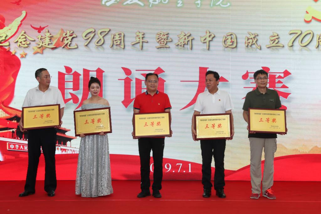 党委书记陈平社在讲话中指出,今天是党的生日,我们举办庆祝建党98周年暨庆祝新中国成立70周年朗诵大赛,就是要用我们发自肺腑的声音,唱响我和我的祖国,表达我们全校各级党组织和共产党员对党的光荣历史的崇敬之情,对党的教育事业的忠诚之志,不忘育人初心,牢记报国使命,为培养能够担当民族复兴大任的时代新人而不懈奋斗。