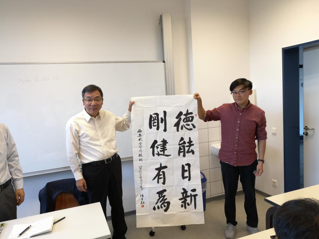 陈平社一行还专程看望了贝博官网中德合作班在德学习学生,并召开座谈会,详细了解同学们在德学习期间思想、学习、生活等方面的情况,勉励大家要珍惜时光、团结奋斗、爱国爱校、树立形象、肩负责任,并送上“德能日新,刚健有为”校训亲笔书法和中秋节的问候。