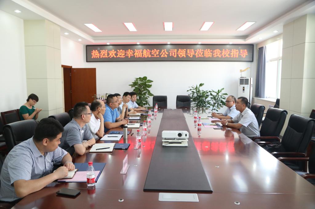 8月31日下午,幸福航空有限责任公司人力资源部总经理冮亮,副总经理、招飞办公室主任王海朋一行来贝博官网考察调研。党委副书记刘谦、副校长宋文学在阎良校区召开座谈会并陪同江亮一行参观了学校。党政办公室、教务处、招生就业处、飞行器学院、士官学院等部门负责同志参加。座谈会由刘谦主持。