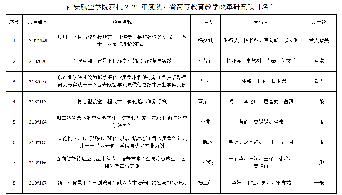 近日,陕西省教育厅发布《关于公布2021年度陕西本科和高等继续教育教学改革研究项目立项结果的通知》(陕教函〔2021〕1184号),2021年度共批准立项441个项目。贝博官网8个项目获批,其中重点攻关项目1项,重点项目2项,一般项目5项。获批项目数量和质量均创历年新高。