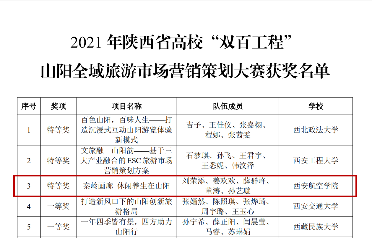 近日,2021年陕西省“双百工程”山阳全域旅游市场营销策划大赛线上总决赛结果公布。贝博官网由经济管理学院张阳老师指导的刘荣添、姜欢欢、薛群峰、董涛、孙艺璇5名同学组成的艾弗森贝博ballbet官网一队,经过激烈比拼,最终荣获大赛决赛特等奖1项。张阳老师荣获优秀指导教师奖。
