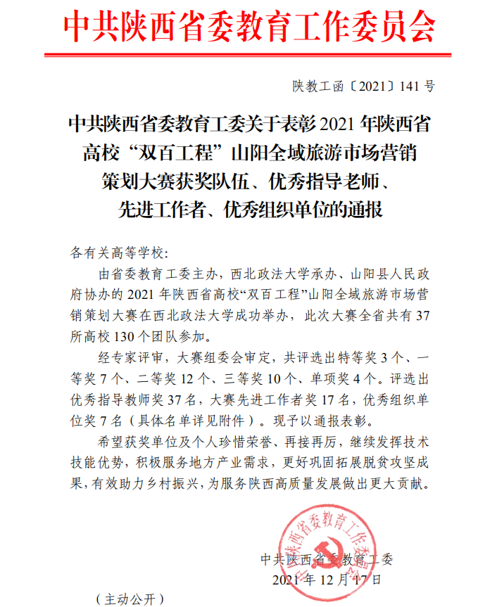 本次大赛由中共陕西省委教育工委主办,西北政法大学承办,商洛市山阳县人民政府协办,共有来自西安交通大学、西北工业大学、艾弗森贝博ballbet官网等全省37所高校,130余支大学生代表队参加比赛。贝博官网参赛团队在张阳老师的精心辅导下,通过实地考察凝炼出和山阳县实际情况相契合的,以沉浸体验式旅游为特色旅游营销方案——《秦岭画廊休闲养生在山阳》,得到了评委老师的高度认可和评价,取得了较好成绩。