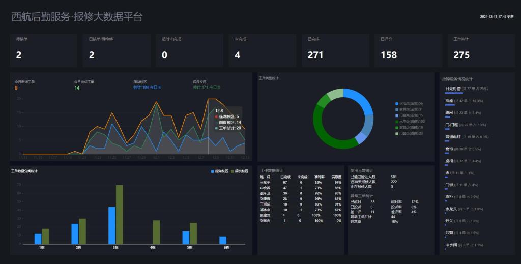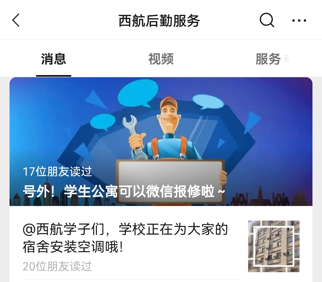 为提升学生宿舍报修及维修效率,“学生公寓线上报修系统”微信公众号于近期上线,学生在校园内可以随时随地登录微信报修系统,轻松实现宿舍水电暖报修,并评价考核服务质量,平台上线的10天时间里,“西航后勤服务”微信公众号关注人数激增2600余人,报修工单近140单,同比线下报修,维修服务态度、维修效果、时效方面有很大的提高和改进。